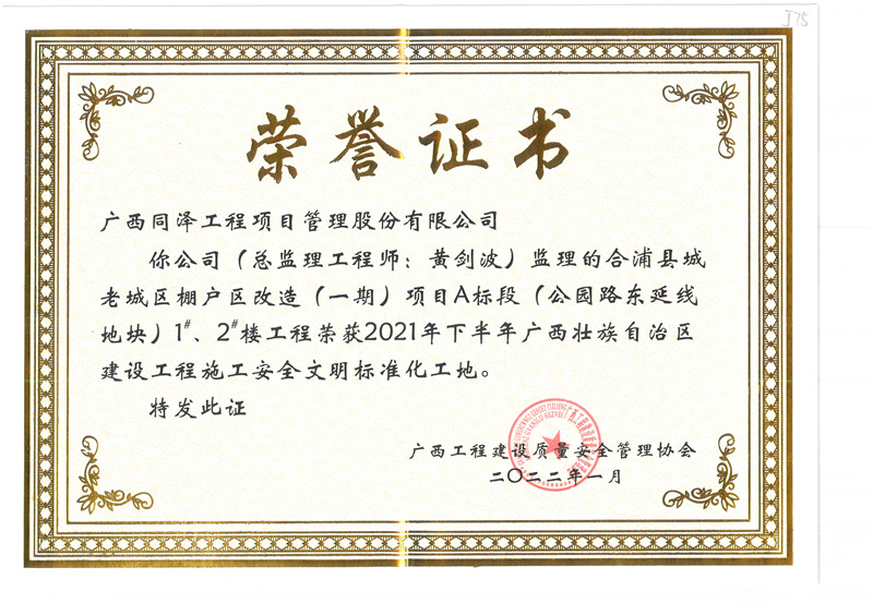 合浦縣城老城區(qū)棚戶區(qū)改造(一期)項目A標段項目榮獲2021年(下半年)廣西壯族自治區(qū)建設(shè)工程施工安全文明標準化工地